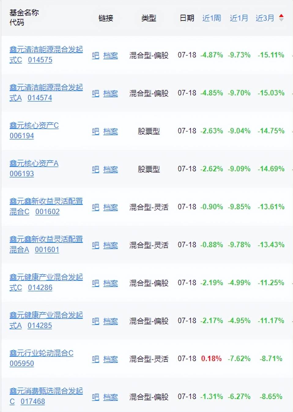 截至7月18日收盘,在全部13703只开放式基金中,今年来业绩倒数前十产品中,华泰柏瑞独占7只,摩根士丹利基金管理(中国)有限公司2只,排在第10的就是鑫元清洁能源混合发起式C,紧挨着的就是鑫元清洁能源混合发起式A。