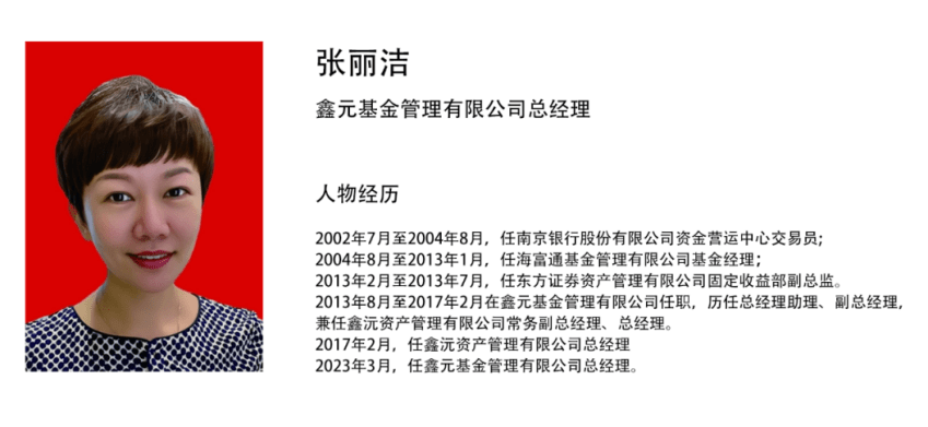 2002年7月,张丽洁任南京银行资金营运中心交易员,此后,她先后去到海富通基金、东方证券资管固定收益部,再到鑫元基金、鑫沅资产,如今再回到鑫元基金。