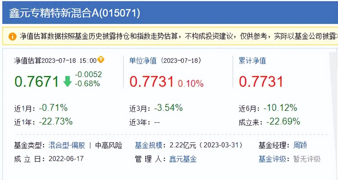 比如, 2022年6月17日成立的鑫元专精特新混合A,成立时份额4.853亿份。截止2023年3月31日,只剩下2.8264亿份,净值规模2.22亿元。截止2023年7月18日收盘,这只基金成立以来净值累计亏损22.69%。