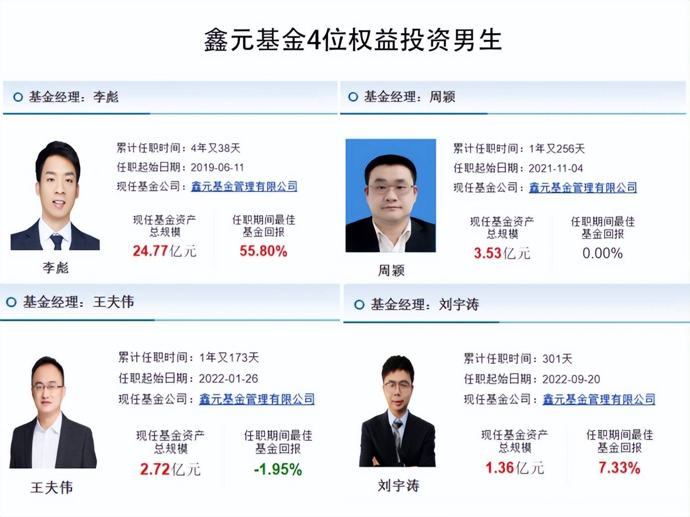 从累计任职时间看,李彪最长,4年又38天,周颖、王夫伟1年出头,刘宇涛301天;从任职期间最佳回报看,也是李彪最高55.8%,鑫元欣享灵活配置混合C。