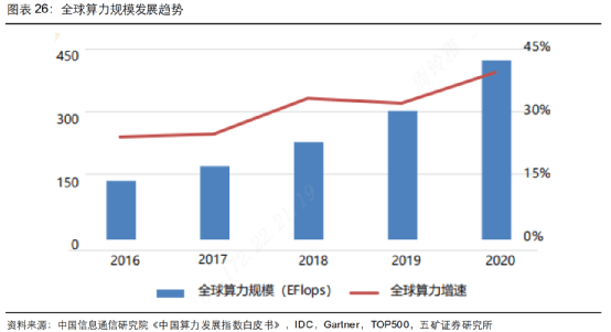 在此背景下,全球算力规模迅速增长,据IDC统计,2020年全球算力总规模达到429EFlops,同比增长39%,其中基础算力规模(FP322,FP32为单精度浮点数,采用32位二进制来表达一个数字,常用于多媒体和图形处理计算)为313EFlops3,智能算力规模(换算为FP32)为107EFlops4,超算算力规模(换算为FP32)为9EFlops5。