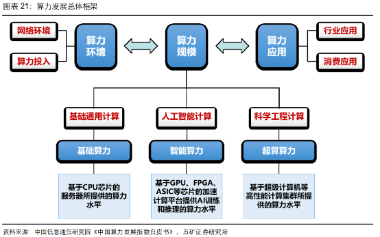 现阶段,整个行业最紧俏的资源就是显卡,因为基础通用算力主要基于CPU芯片的服务器所提供的计算能力。除此之外,智能算力主要是基于GPU、FPGA、ASIC等芯片的加速计算平台提供人工智能训练和推理的计算能力;超算算力主要是基于超级计算机等高性能计算集群所提供的计算能力。