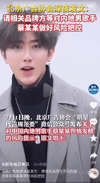 7月1日晚,北京广告协会明星代言规范委官方公众号发布《关于对中国内地男歌手蔡某某舆情发酵的风险提示》,文中称,近日,中国内地男歌手蔡某某事件逐渐发酵,该事件有进一步炒作及扩大趋势,请相关品牌方、演艺经纪公司、MCN经纪机构对中国内地男歌手蔡某某做好风险把控。