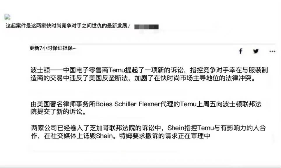 据悉,Temu聘请的知名美国律所BSF已经在上周五向波士顿联邦法庭递上了诉状。Temu在起诉书中称,SHEIN“利用市场支配力量强迫服装厂商与之签订独家协议,阻止他们与Temu合作”。Temu表示,SHEIN的行为导致价格上涨,消费者选择减少,“还阻碍了美国超快时尚市场的扩张”。