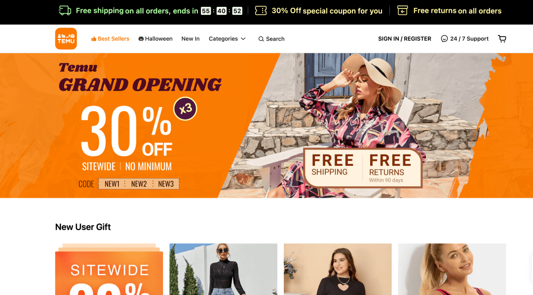 据介绍,2022年9月1日,Temu正式在美国上线,寓意“TEAM UP, PRICE DOWN”,通过网站(https://temu.com)及其移动应用程序 (Android / iOS) 为用户提供服务和产品。数据显示,9月16日,Temu登顶美国Google Play购物类软件单日下载榜第一;上线的两周时间,美国市场iOS和Google Play下载量激增860%。