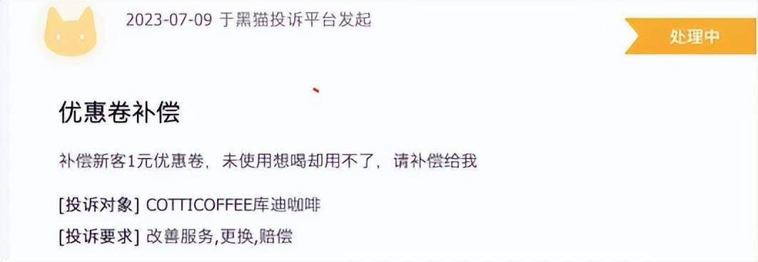 新客1元优惠券活动,本是一次绝佳的引流机会,但在黑猫投诉平台却有消费者反应,自己的优惠券没使用,想喝却用不了。