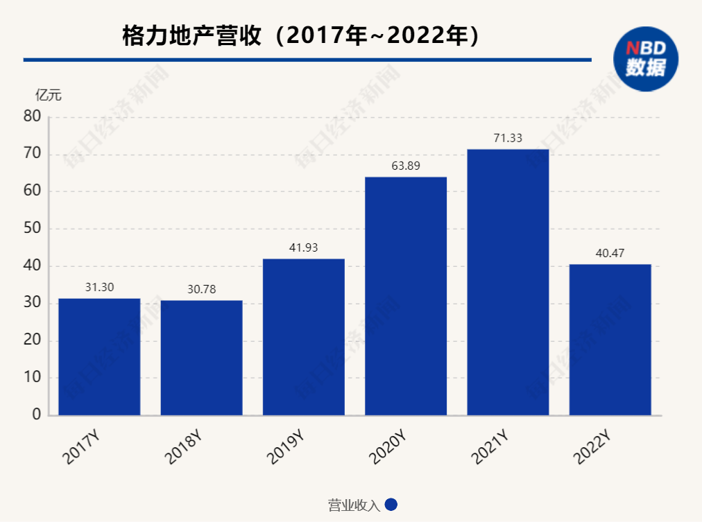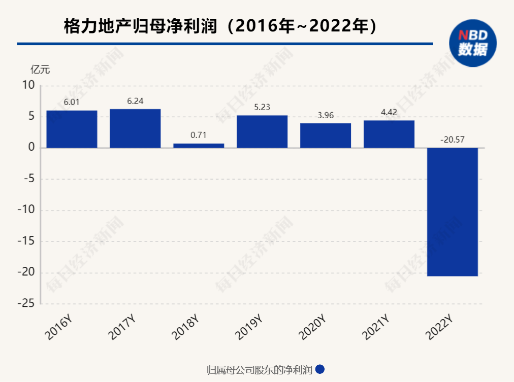 《每日经济新闻》记者梳理格力地产年报发现,2022年可以说是格力地产的“重要拐点”,当年归母净亏损达20.57亿元,打破了之前的持续盈利态势。而2017~2021年,格力地产的归母净利润分别为6.24亿元、0.70亿元、5.23亿元、3.96亿元、4.42亿元,共计20.55亿元。也就是说,格力地产过去5年的净利润总和不及过去一年的亏损。