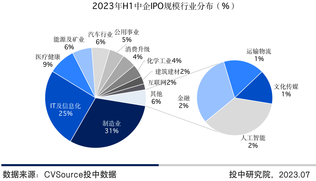 前十大IPO项目的募资规模均在30亿元以上,占H1募资总规模约25%,主要集中在信息技术行业和先进制造
