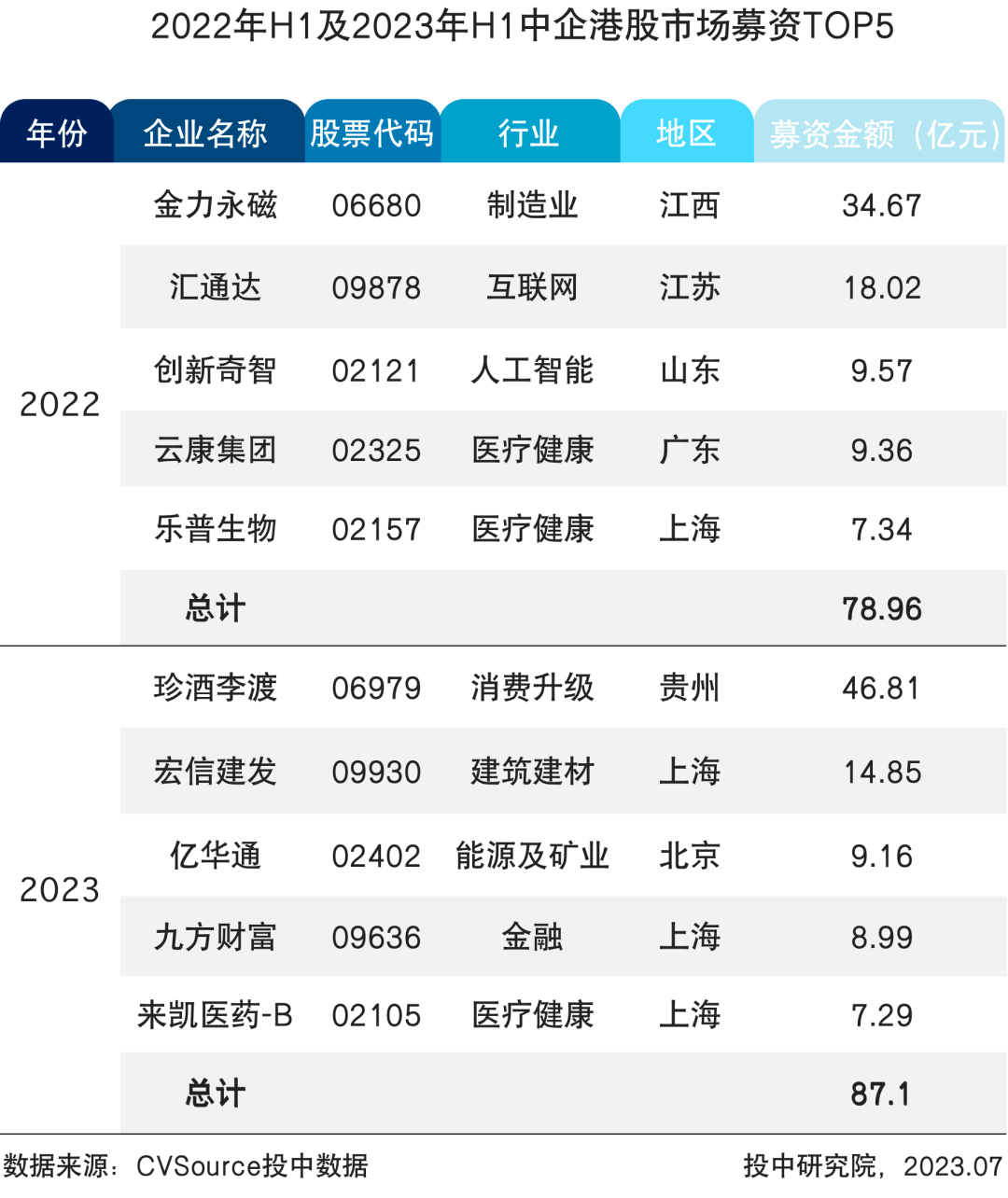 表5 2022年H1及2023年H1中企港股市场募资TOP5