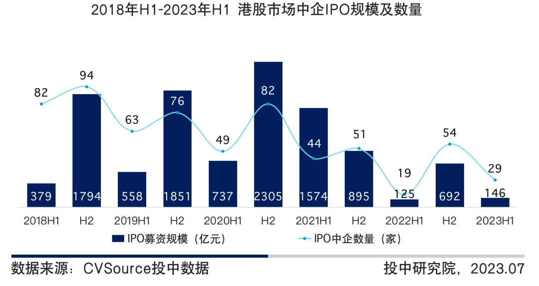 图8 2018年H1-2023年H1 港股市场中企IPO规模及数量