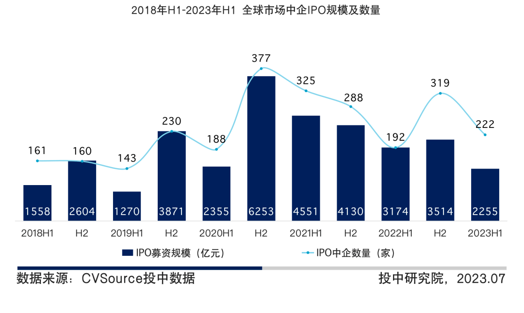 图4 2018年H1-2023年H1 全球市场中企IPO规模及数量