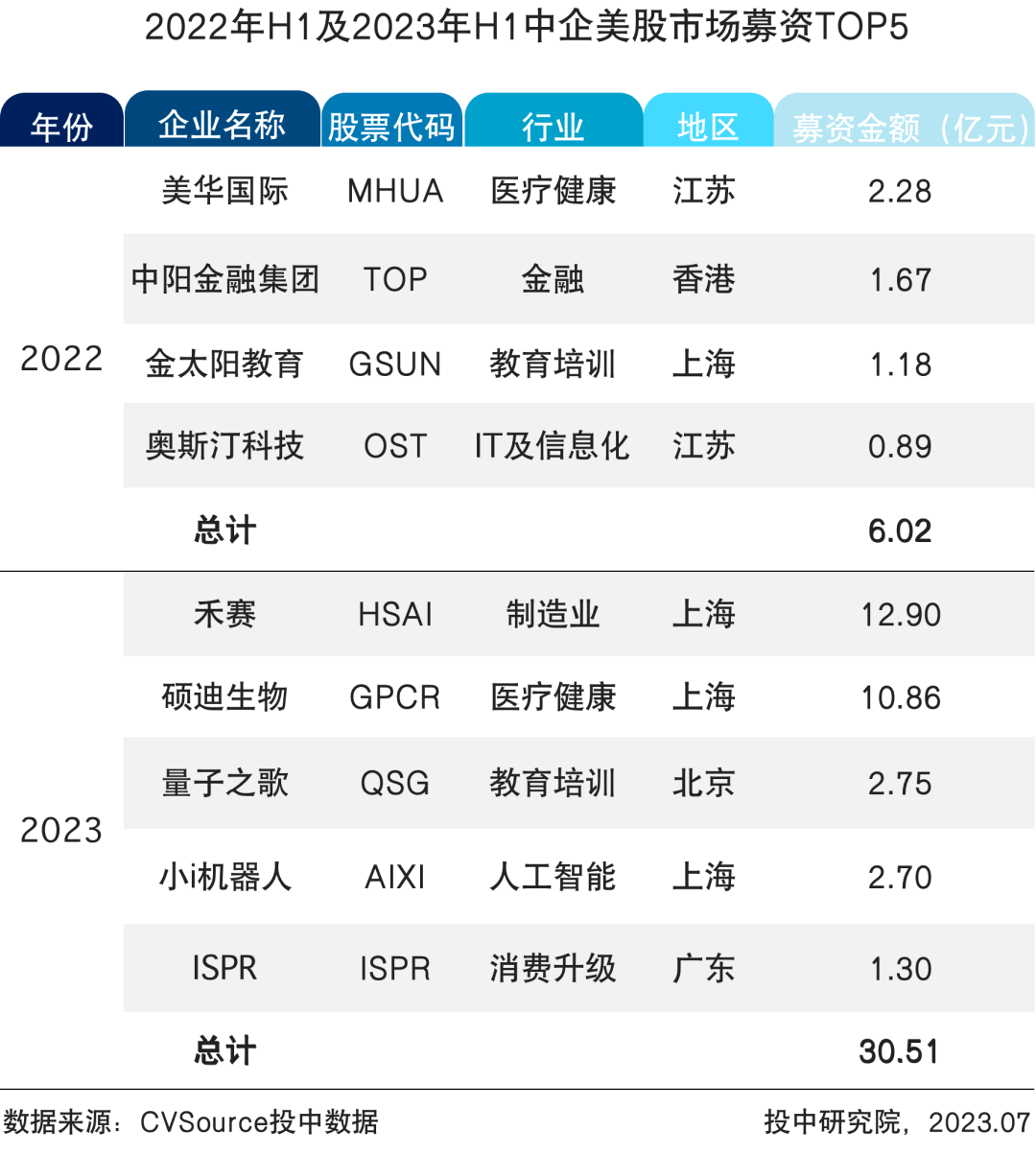 表6 2022年H1及2023年H1中企美股市场募资TOP5