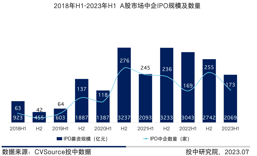 图6 2018年H1-2023年H1 A股市场中企IPO规模及数量