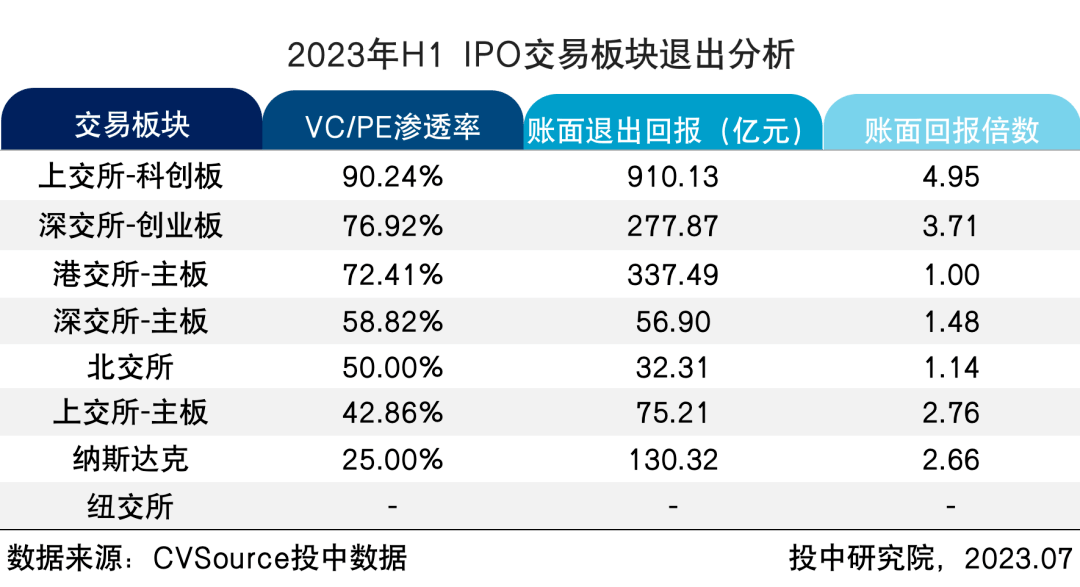 2023上半年,共143家具有VC/PE背景的中企实现上市,VC/PE机构IPO渗透率为64.41%,平均账面回报率为3.52,VC/PE渗透率最高的企业主要集中在上交所科创板、深交所创业板、港交所主板,其中科创板IPO的VC/PE渗透率达到90.24%;在退出回报方面,上交所科创板账面退出回报高达910.13亿元,占总退出回报的50%,其账面回报倍数为4.95,二者均大幅领先其他交易板块。