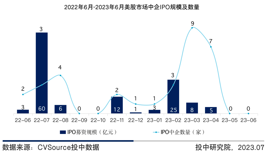图12 2022年6月-2023年6月美股市场中企IPO规模及数量