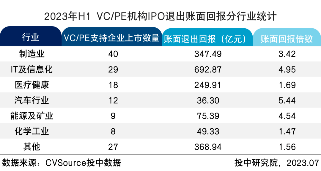 表2 2023年H1 VC/PE机构IPO退出账面回报分行业统计