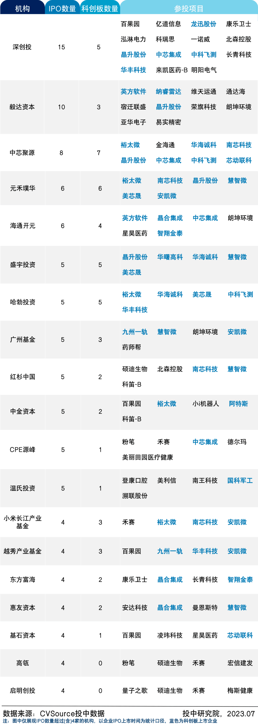 表1 2023上半年VC/PE机构IPO战绩一览