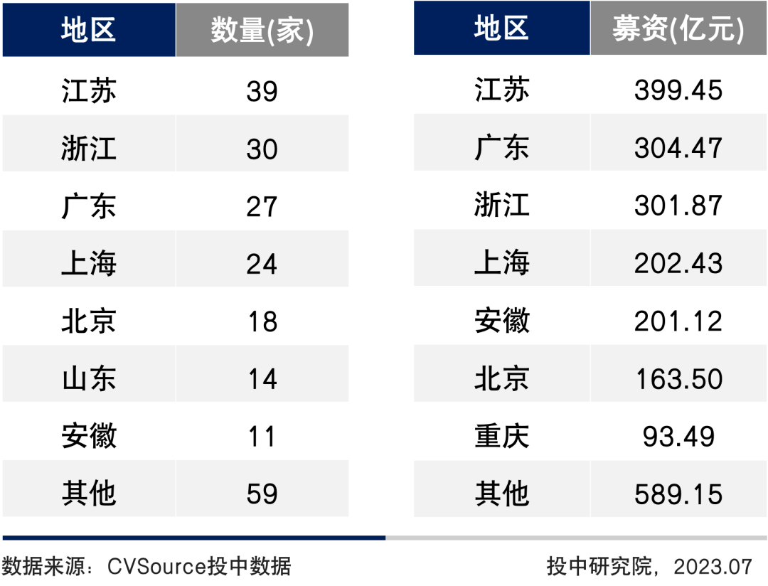2023上半年,江苏地区中企IPO数量为39家,位于榜首,浙江、广东紧随其后,分别为30家、27家;募资规模方面,江苏地区夺冠,IPO募资金额为399.45亿元;广东、浙江分别位居第二和第三。