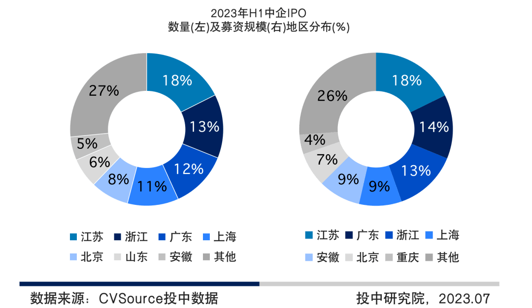 图15 2023年H1中企IPO数量及募资规模地区分布
