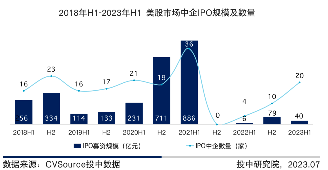 图11 2018年H1-2023年H1 美股市场中企IPO规模及数量