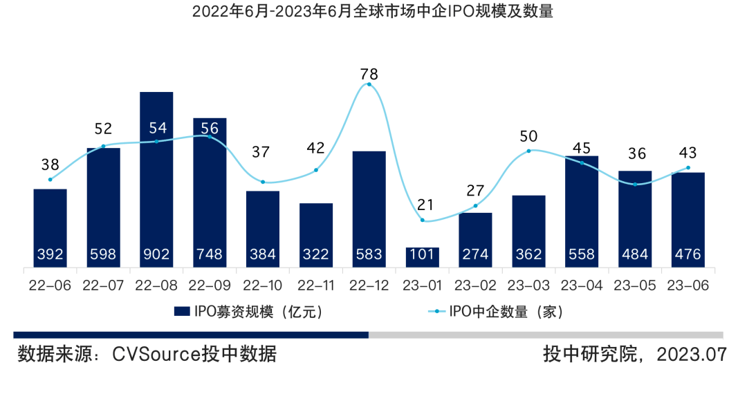 图5 2022年6月-2023年6月全球市场中企IPO规模及数量