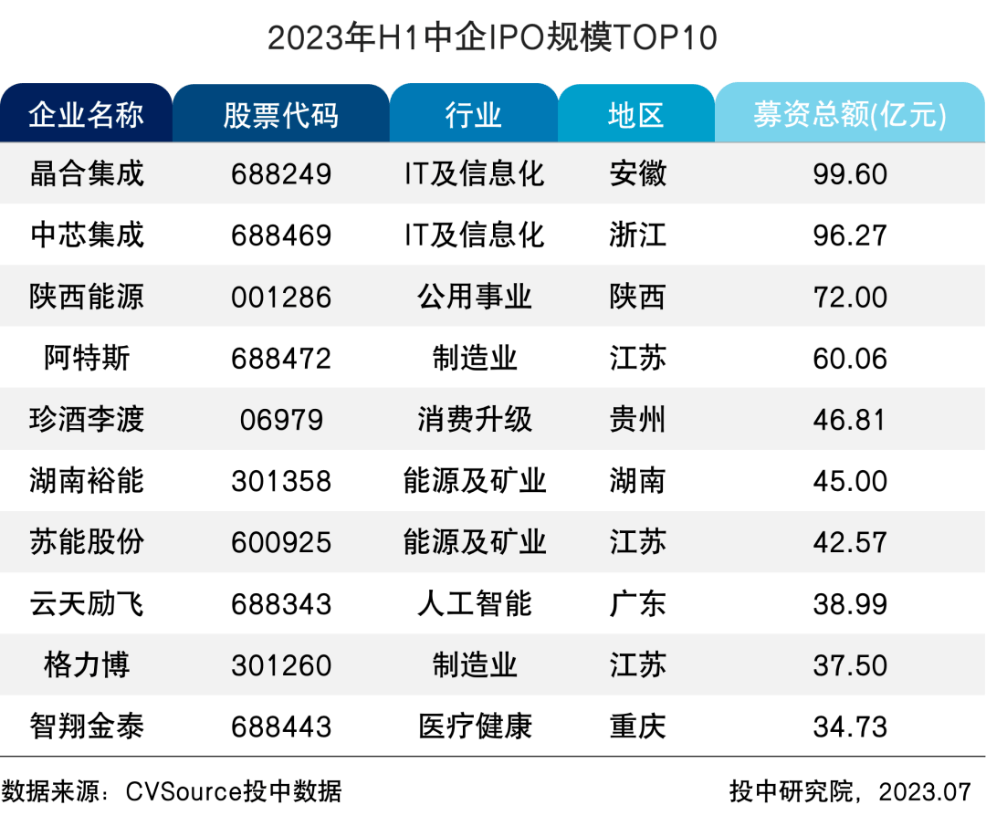下表为2023上半年中企IPO规模TOP10。