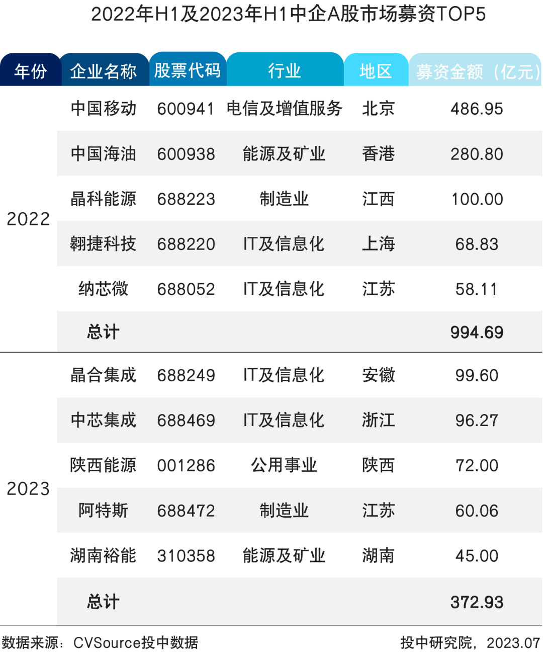 表4 2022年H1及2023年H1中企A股市场募资TOP5