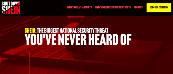 SHEIN利用美国法律制度设计出来的“商业模式”,被美国一个名叫“Shutdown SHEIN”(关闭SHEIN)的组织最早提出,并一直着力推动美国政府和公众反对SHEIN。该组织自称由“知名品牌、个人和人权团体”组成,反对SHEIN的商业模式,并在美国媒体上购买了大量广告版面批评 SHEIN。他们还会见美国立法者,迫使这些立法者严厉打击SHEIN。