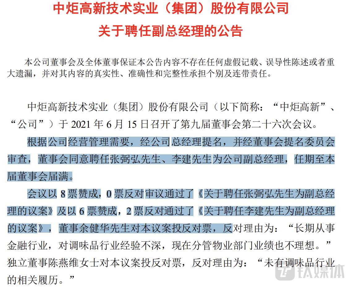 之后,中炬高新再发公告,称公司董事会在7月17日晚间决议,免去副总经理兼财务负责人张弼弘的职务。同时,公司拟聘任邓祖明为总经理,孔令云、秦君雪为副总经理。