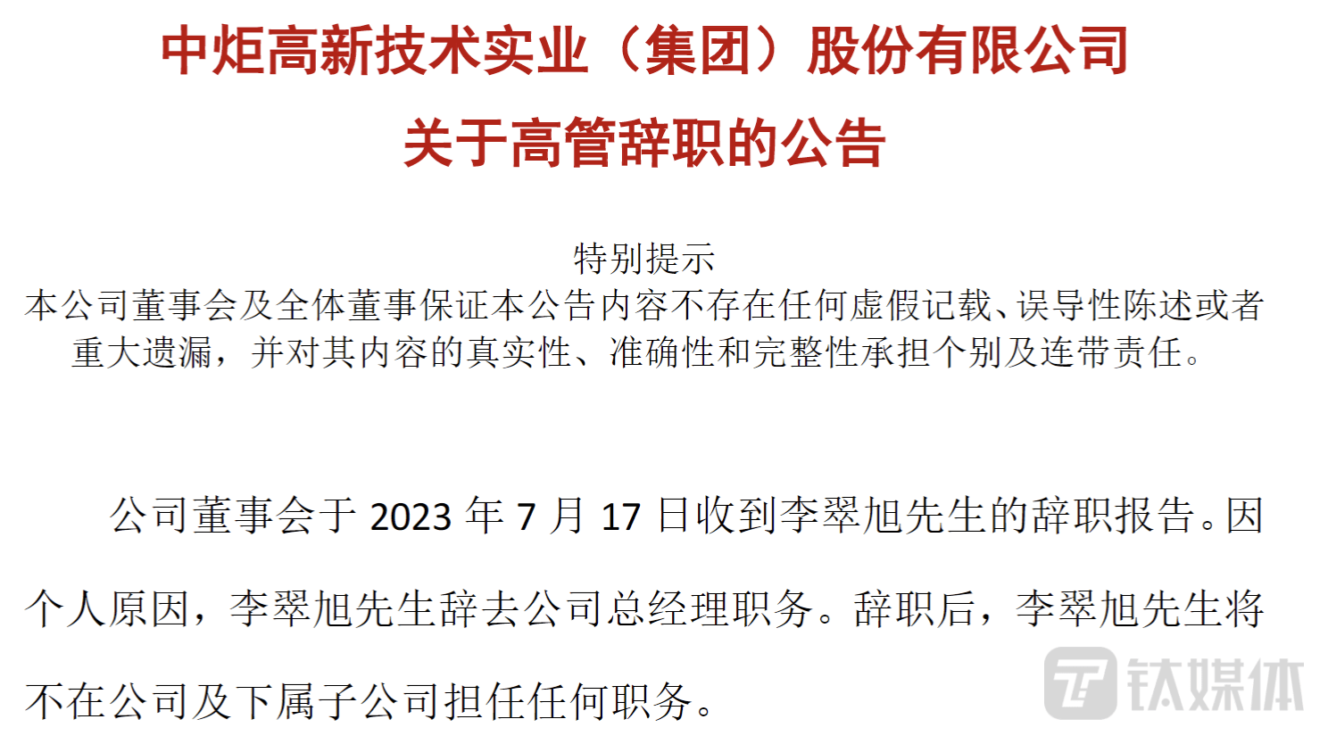 7月18日晚间,中炬高新(600872.SH)连发多则公告,与公司人事变动相关。从时间上来看,公司先发布一则关于高管辞职的公告,称公司总经理李翠旭因个人原因辞职;辞职后,李翠旭将不在公司及下属子公司担任任何职务。