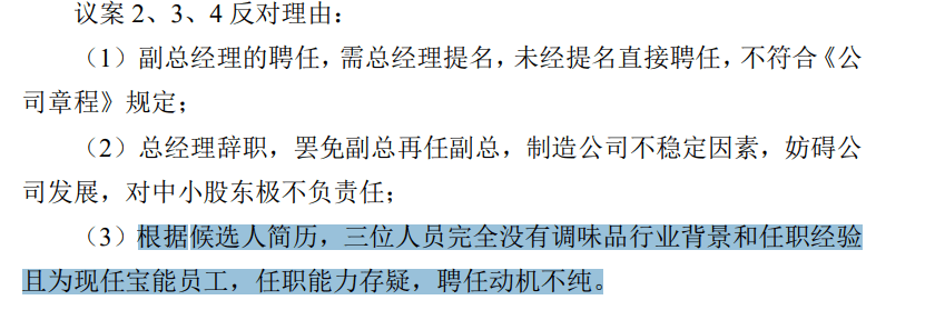 同时,获得提名的三名“宝能系”成员的任职能力也遭到质疑,余健华称三名高管完全没有调味品行业背景和任职经验,且为现任宝能员工,任职能力存疑,聘任动机不纯;而另两位董事万鹤群、甘耀仁反对理由与余健华相似。