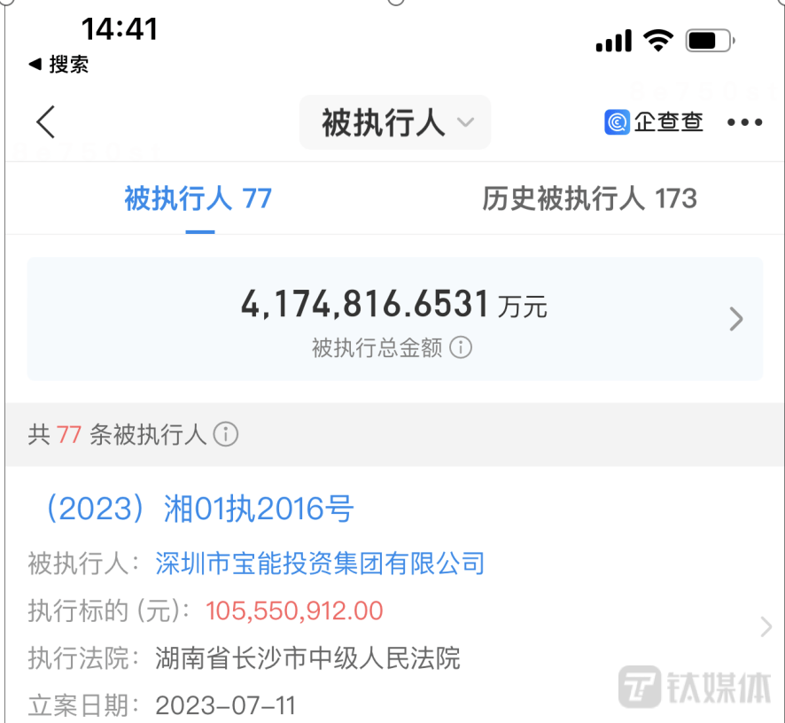 据天眼查信息显示,近日,深圳市宝能投资集团有限公司新增多个被执行人信息,执行标的合计约31亿余元,被执行人还包括宝能旗下多家公司,如宝能地产股份有限公司、宝能世纪有限公司等。目前,宝能集团被强制执行案件高达77件,其被强制执行的金额累计为417.48亿元。同时,该公司存在多条限制消费令、失信被执行人(老赖)和终本案件信息,未履行总金额超2亿元。