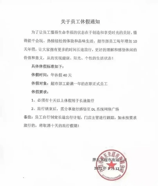 2021年,于东来决定将员工的带薪年假从30天延长为40天,并且要求其中10天必须要用于长途旅行,加上法定节假日与双休,每年,胖东来的员工休息日都能达到145天。