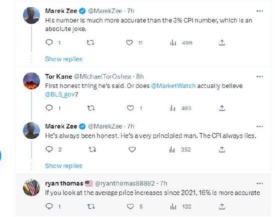 在推特上有关彭斯的这条新闻下面,有网友评论称:“他的数字比3%的CPI数字准确得多,后者绝对是一个笑话。”