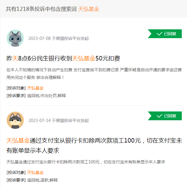 黑猫投诉平台显示,截至2023年7月19日,和“天弘基金”有关的投诉量共有1218条,在该平台上的投诉量居于公募基金前列。
