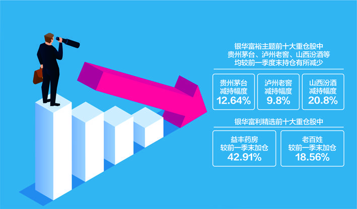 最明显的变化在于减仓可选消费,如高端白酒等,加仓医药。以旗下管理的银华富裕主题为例,在前十大重仓股中,贵州茅台、泸州老窖、山西汾酒等均较前一季度末持仓有所减少,Wind统计显示,减持幅度分别为12.64%、9.8%、20.80%。而在银华富利精选前十大重仓股中,益丰药房、老百姓等则分别较前一季末加仓42.91%、18.56%。