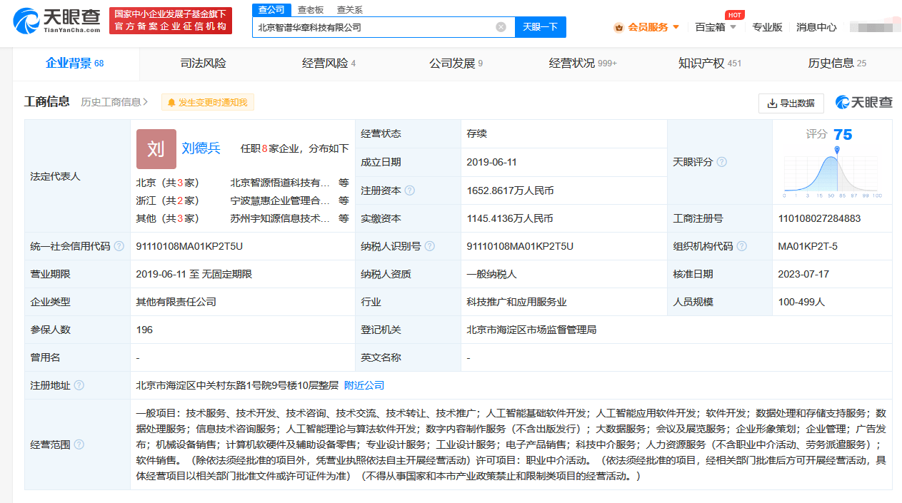 北京智谱华章科技有限公司成立于2019年6月,法定代表人为刘德兵,经营范围含技术服务、人工智能基础软件开发、数据处理和存储支持服务、科技中介服务等。