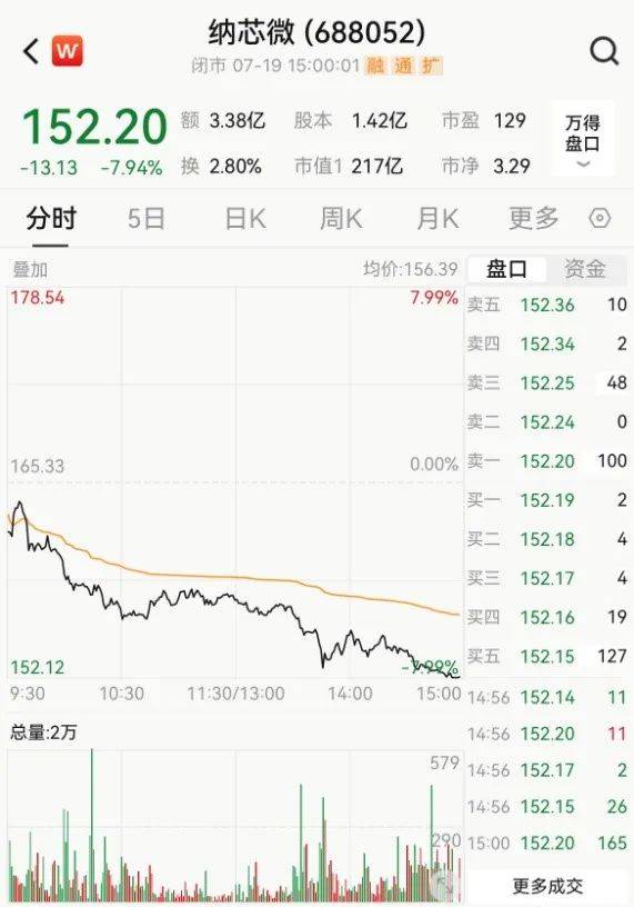7月19日,纳芯微大跌7.94%,收于152.2元/股,创下上市以来的新低,市值为217亿元。