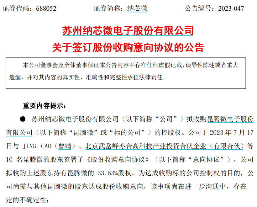 根据公告,纳芯微与JING CAO(曹靖)等10名昆腾微的股东签署协议,拟通过现金方式收购昆腾微33.63%股权,以获得后者的控制权。