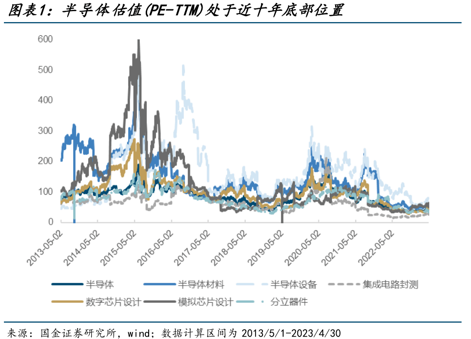 事实上,此前曾备受追捧的半导体行业,正处于估值低谷。国金证券提供的数据显示,半导体估值处于近10年底部位置。