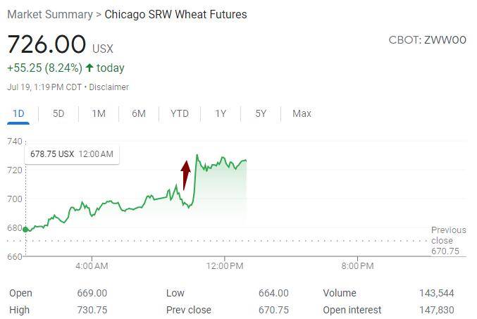 这是最近俄罗斯停止执行黑海粮食协议后小麦期货再次盘中大涨。