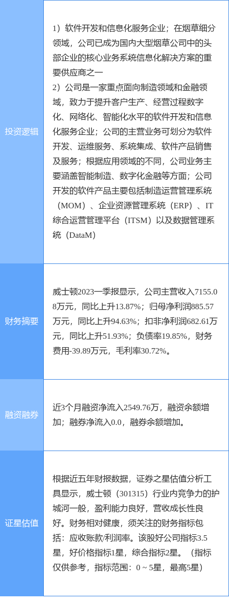 威士顿涨停收盘,收盘价59.04元。该股于9点37分涨停,未打开涨停,截止收盘封单资金为6618.54万元,占其流通市值5.37%。