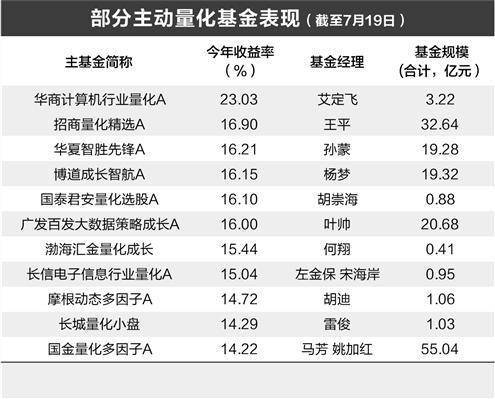 具体来看,主动量化基金中,艾定飞的华商计算机行业量化A今年以来收益率为23.03%,王平的招商量化精选A年内收益率为16.9%,孙蒙的华夏智胜先锋A、杨梦的博道成长智航、胡崇海的量化选股A等也均有不俗的业绩表现。