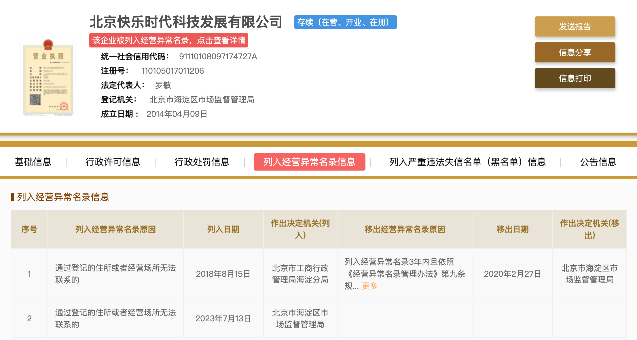 近日,国家企业信用信息公示系统显示,北京快乐时代科技发展有限公司因通过登记的住所或者经营场所无法联系,于7月13日被北京市海淀区市场监督管理局列入经营异常名录。