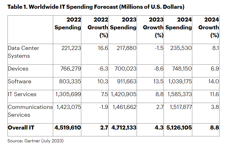IT之家 7 月 20 日消息,根据市场调查机构 Gartner 公布的预测数据,2023 年全球 IT 支出预计将达到4.7 万亿美元(IT之家备注:当前约 33.98 万亿元人民币),较 2022 年增长 4.3%。
