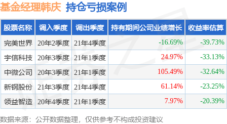 韩庆管理的中金新锐股票A基金在20年2季度买入完美世界,在持有1年又2个季度后在21年4季度卖出。持有期间的估算收益率为-39.73%,持有期间完美世界在2020年到2021年的年报营业总收入降幅为16.69%。