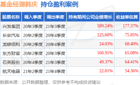 韩庆管理的中金新锐股票A基金在20年2季度买入长安汽车,在持有2个季度后在20年4季度卖出。持有期间的估算收益率为75.85%,持有期间长安汽车在2019年到2020年的年报归属净利润增幅达225.6%。