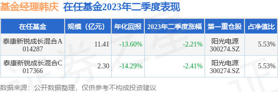 截止2023年二季度末,基金经理韩庆旗下共管理2只基金,本季度表现最佳的为泰康新锐成长混合A(014287),季度净值跌2.21%。