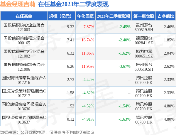 截止2023年二季度末,基金经理吉莉旗下共管理8只基金,本季度表现最佳的为国投瑞银策略回报混合A(013636),季度净值跌1.54%。