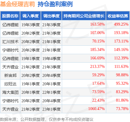 吉莉管理的国投瑞银核心企业混合基金在19年3季度买入亿纬锂能,在持有2年又0个季度后在21年3季度卖出。持有期间的估算收益率为499.25%,持有期间亿纬锂能在2019年到2021年的年报营业总收入增幅达163.58%。